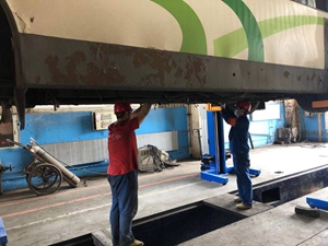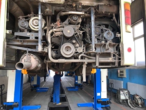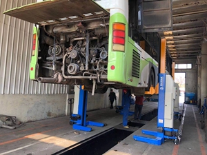 隨著新車型的疊新?lián)Q代,傳統(tǒng)的地溝舉升已不能滿足新車型的維保需求,為更安全,便捷地進(jìn)行車輛各項(xiàng)維保工作,總公司在資金緊張情況下,籌措資金,為修理公司購置4臺(tái)充電移動(dòng)式重卡舉升機(jī),該移動(dòng)式重卡舉升機(jī)采用無線信號(hào)連接,蓄電池供電,液壓系統(tǒng)平穩(wěn)安全舉升,不需要固定工位使用,操作人員直立地面維修,操作便捷。