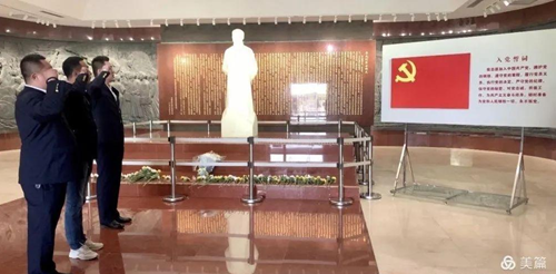 當大家踏上象征李大釗革命生涯的38級臺階,走進紀念館,步入威嚴、莊重的紀念館大廳,在李大釗塑像前整齊列隊、莊嚴肅立,集體默哀深深鞠躬,表達緬懷和敬意。之后,面對鮮紅的黨旗,唐山公交基層黨支部書記帶領(lǐng)兩名預(yù)備黨員緊握右拳,莊嚴宣誓。支部黨員干部集體重溫了入黨誓詞,在誓言中共同表達了對共產(chǎn)黨的無比忠誠和對革命精神的無比敬佩。