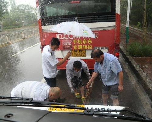 12時30分,207路車在行至開平路段時出現(xiàn)故障。機務隊長張繼民立即開著拖車前往現(xiàn)場,不料返回途中拖車也壞了,得知情況的隊長立即與修理車間聯(lián)系,又派出安全員孫濤、張利明和修理工王金偉火速趕赴現(xiàn)場冒雨搶修,直至晚上六點多,故障車和拖車才順利返回車場,而參與搶修的幾名工作人員早已經(jīng)全身濕透。